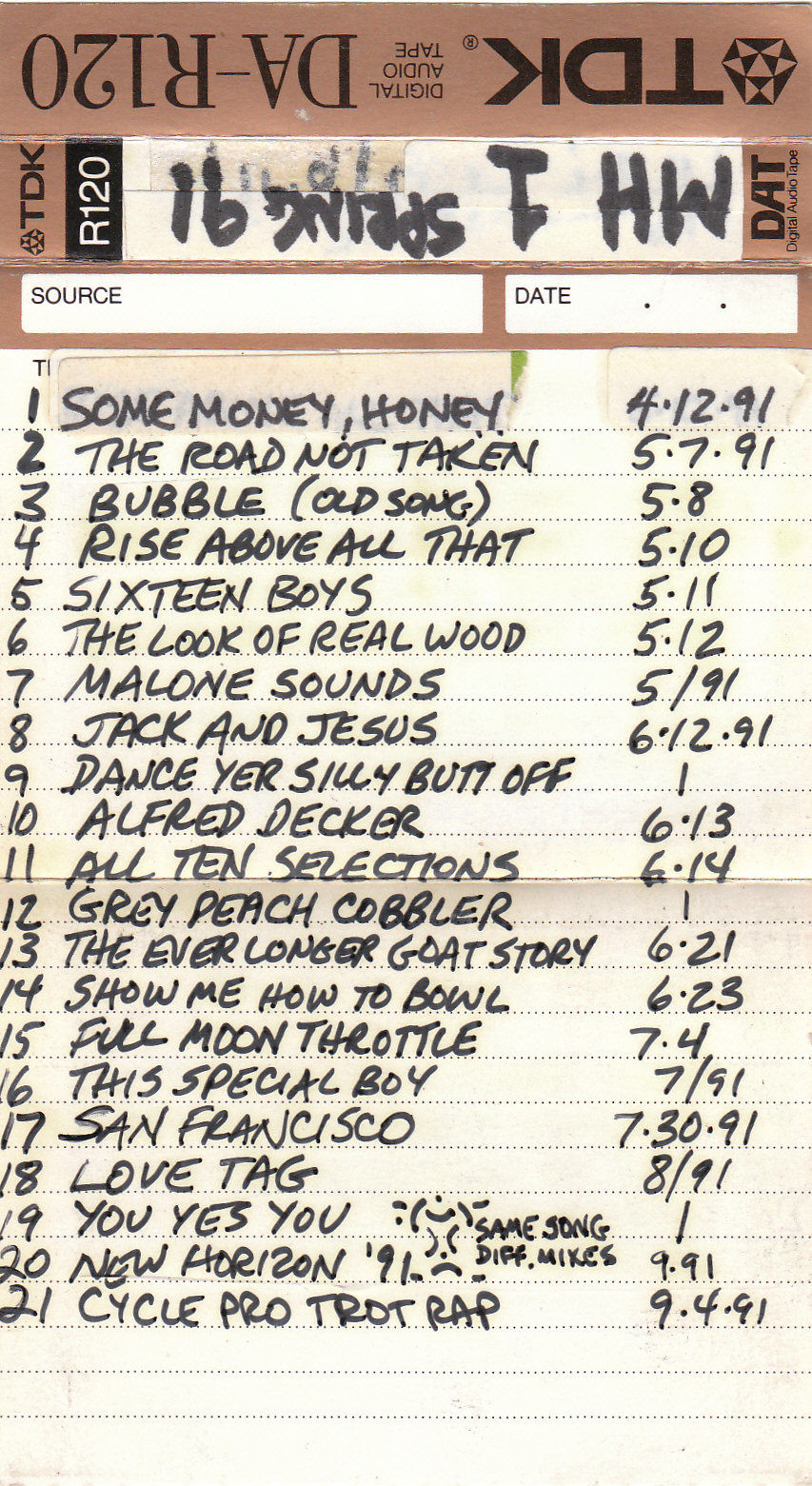 Label Area Sixteen Boys Rise Above All That Bubble (Old Song) The Road Not Taken Some Money Honey The Look of Real Wood Malone Sounds Jack and Jesus Dance Yer Silly Butt Off Alfred Decker All Ten Selections Grey Peach Cobbler The Ever Longer Goat Story Show Me How to Bowl Full Moon Throttle This Special Boy San Francisco Love Tag You Yes You New Horizon 91 (Same Song Different Mikes) Cycle Pro Trot Rap